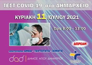 Συνεχίζονται τα τεστ ανίχνευσης κρουσμάτων κορωνοϊού με μία νέα δράση που θα πραγματοποιηθεί την Κυριακή 11-7-2021 και από ώρα 8:00