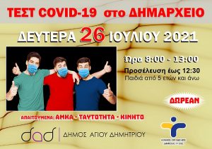 Συνεχίζονται τα τεστ ανίχνευσης κρουσμάτων κορωνοϊού τη Δευτέρα 26 Ιουλίου 2021 και από ώρα 8:00 έως 13:00 (προσέλευση έως 12:30)