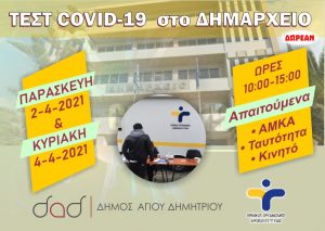 Την Τρίτη 13 Απριλίου και την Κυριακή 18 Απριλίου 2021, από ώρα 10:00 έως 15:00, κινητή μονάδα του ΕΟΔΥ θα