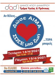 Το Τμήμα Υγείας και Πρόνοιας του Δήμου Αγίου Δημητρίου διοργανώνει διήμερο εθελοντικής αιμοδοσίας, στο 3ο ΚΑΠΗ (Ολύμπου 36) Την Τετάρτη