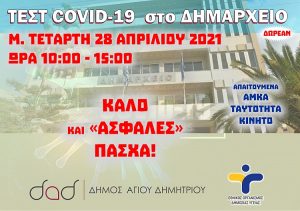 Τη Μ. Τετάρτη 28 Απριλίου 2021, από ώρα 10:00 έως 15:00, κινητή μονάδα του ΕΟΔΥ θα βρίσκεται έξω από το Δημαρχείο