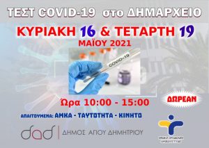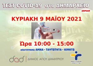 Την Κυριακή 9 Μαΐου 2021, από ώρα 10:00 έως 15:00, κινητή μονάδα του ΕΟΔΥ θα βρίσκεται έξω από το Δημαρχείο Αγίου