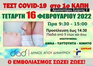 ⚠️ Συνεχίζονται τα τεστ ανίχνευσης κρουσμάτων κορωνοϊού την Τετάρτη 16 Φεβρουαρίου 2022 και από ώρα 9:30 έως 15:00 (προσέλευση έως