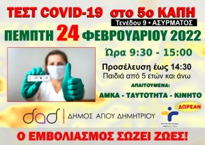 ⚠️ Συνεχίζονται τα τεστ ανίχνευσης κρουσμάτων κορωνοϊού την Πέμπτη 24 Φεβρουαρίου 2022 και από ώρα 9:30 έως 15:00 (προσέλευση έως