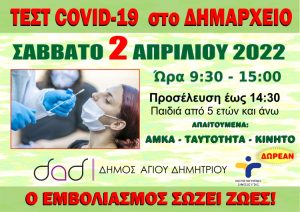 ⚠️ Συνεχίζονται τα τεστ ανίχνευσης κρουσμάτων κορωνοϊού το Σάββατο 2 Απριλίου 2022 και από ώρα 9:30 έως 15:00 (προσέλευση έως