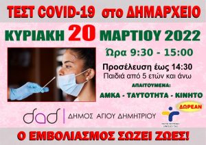 ⚠️ Συνεχίζονται τα τεστ ανίχνευσης κρουσμάτων κορωνοϊού την Κυριακή 20 Μαρτίου 2022 και από ώρα 9:30 έως 15:00 (προσέλευση έως