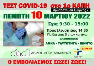 ⚠️ Συνεχίζονται τα τεστ ανίχνευσης κρουσμάτων κορωνοϊού την Πέμπτη 10 Μαρτίου 2022 και από ώρα 9:30 έως 15:00 (προσέλευση έως