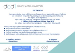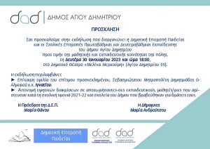 H Δημοτική Επιτροπή Παιδείας και οι Σχολικές Επιτροπές Πρωτοβάθμιας και Δευτεροβάθμιας Εκπαίδευσης του του Δήμου Αγίου Δημητρίου, σας προσκαλούν στην