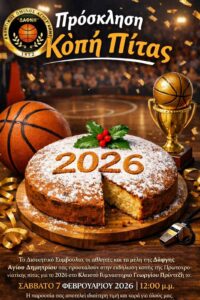 Σας προσκαλούμε στην κοπή της πρωτοχρονιάτικης πίτα του Πολιτιστικού Συλλόγου Γυναικών Αγίου Δημητρίου, την Κυριακή 25 Ιανουαρίου 2026, στις 17:00,