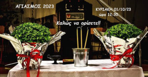 Σας προσκαλούμε στον αγιασμό μας, την Κυριακή 1-10-2023, στις 12:30μ.μ. Θα ακολουθήσουν κεράσματα από μέλη του συλλόγου μας, καθώς και