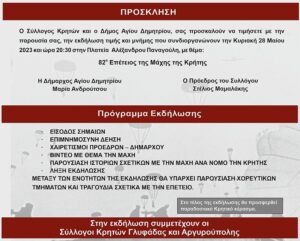 Ο Σύλλογος Κρητών και ο Δήμος Αγίου Δημητρίου με αφορμή την 82η επέτειο της Μάχης της Κρήτης, συνδιοργανώνουν εκδήλωση τιμής