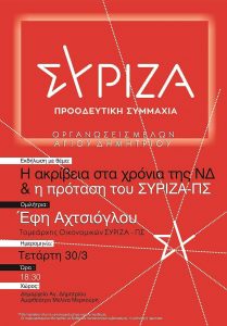 Οι οργανώσεις μελών του ΣΥΡΙΖΑ - Προοδευτική συμμαχία Αγίου Δημητρίου, σας καλούν στην εκδήλωση με θέμα "Η ΑΚΡΙΒΕΙΑ ΣΤΑ ΧΡΟΝΙΑ