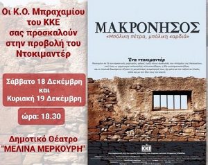 Το ντοκιμαντέρ της ΚΕ του ΚΚΕ, με τίτλο ΜΑΚΡΟΝΗΣΟΣ «Μπόλικη πέτρα, μπόλικη καρδιά», μετά την πρώτη προβολή - παρουσίαση που