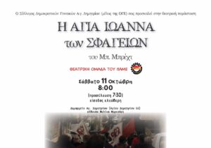 Ο Σύλλογος Δημοκρατικών Γυναικών ( μέλος της ΟΓΕ) , σας προσκαλεί στην θεατρική παράσταση η Αγία Ιωάννα των Σφαγείων του