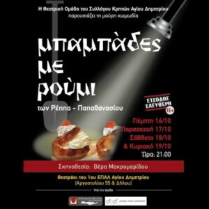 Ο Σύλλογος Κρητών Αγίου Δημητρίου σας προσκαλεί στην παράσταση της αγαπημένης μαύρης κωμωδίας "Μπαμπάδες με ρούμι" από τη Θεατρική Ομάδα