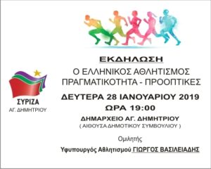 "Ο ελληνικός αθλητισμός - πραγματικότητα - προοπτικές", είναι το θέμα της εκδήλωσης - συζήτησης που διοργανώνει ο ΣΥΡΙΖΑ Αγ. Δημητρίου,