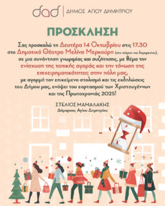 Στο πλαίσιο των εορταστικών εκδηλώσεων "Μια Πόλη - Μια Γιορτή", για τα Χριστούγεννα και την Πρωτοχρονιά, ο Δήμος Αγίου Δημητρίου