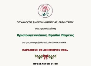 Ο Σύλλογος Ανθέων Αγίου Δημητρίου εναρμονίζεται με το εορταστικό κλίμα των ημερών και μας προσκαλεί σε μια Χριστουγεννιάτικη Βραδιά Παρέας