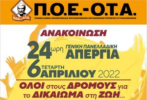 Η Πανελλήνια Ομοσπονδία Εργαζομένων Οργανισμών Τοπικής Αυτοδιοίκησης (ΠΟΕ-ΟΤΑ) συμμετέχει στην 24ωρη Πανεργατική - Πανελλαδική Απεργία που κήρυξε η ΑΔΕΔΥ, την