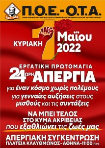 Η Πανελλήνια Ομοσπονδία Εργαζομένων Οργανισμών Τοπικής Αυτοδιοίκησης (ΠΟΕ-ΟΤΑ) σας καλεί στην στη συγκέντρωση που θα γίνει την Κυριακή 1 Μαΐου