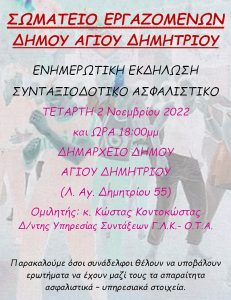 Το Δ.Σ του Σωματείου Εργαζομένων Δήμου Αγίου Δημητρίου σας προσκαλεί να συμμετέχετε στην ενημερωτική εκδήλωση για τα συνταξιοδοτικά θέματα, την ΤΕΤΑΡΤΗ 2 ΝΟΕΜΒΡΙΟΥ 2022