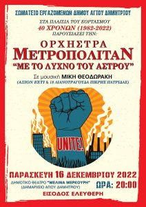 Το Σωματείο Εργαζομένων του Δήμου Αγίου Δημητρίου, διοργανώνει επετειακή συναυλία για τα 40 χρόνια (1982-2022) από την ίδρυσή του, την