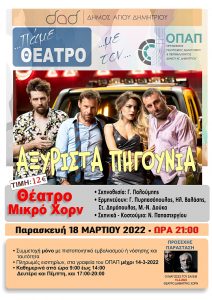 🎭 Την Παρασκευή 18 μαρτίου 2022 και ώρα 21:00, πάμε θέατρο, στο έργο "Αξύριστα πηγούνια", στο Θέατρο Μικρό Χορν. Η