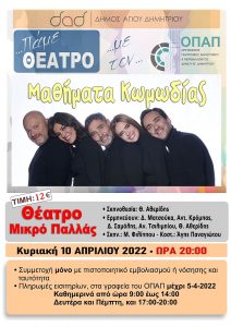🎭 Την Κυριακή 10 Απριλίου 2022 και ώρα 20:00, πάμε θέατρο, στο έργο "Μαθήματα Κωμωδίας", στο Θέατρο Μικρό Παλλάς. Η