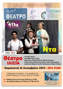 🎭 Την Παρασκευή 16 Δεκεμβρίου 2022 και ώρα 21:00, πάμε θέατρο, στο έργο "ΝΤΑ", στο Θέατρο ΙΛΙΣΙΑ. Η τιμή των