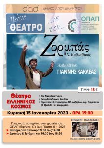 🎭 Την Κυριακή 15 Ιανουαρίου 2023 και ώρα 19:00, πάμε θέατρο, στο έργο "Ζορμπάς", στο Θέατρο ΕΛΛΗΝΙΚΟΣ ΚΟΣΜΟΣ. Η τιμή