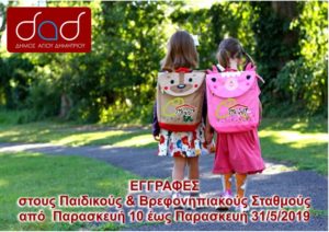 Από την Παρασκευή 10 έως την Παρασκευή 31/5/2019, θα γίνονται δεκτές οι αιτήσεις εγγραφών στους Παιδικούς και Βρεφονηπιακούς Σταθμούς του