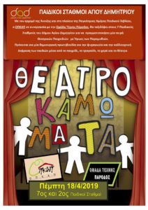 Συνεχίζονται την Πέμπτη 18-4-2019 στους 7ο και 2ο Παιδικούς Σταθμούς τα "Θεατροκαμώματα". Πρόκειται για μία δημιουργική πρωτοβουλία για την ψυχαγωγία και την