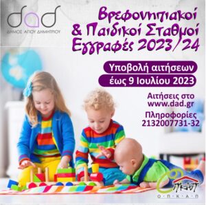 Από 22/5/2023 έως 9/7/2023, θα πραγματοποιηθούν οι αιτήσεις εγγραφών στους Παιδικούς και Βρεφονηπιακούς Σταθμούς του Δήμου Αγίου Δημητρίου, για την