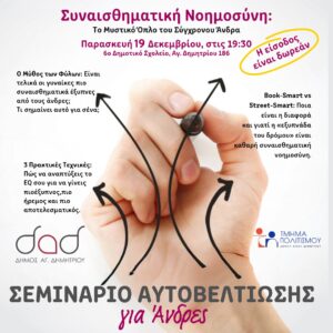 Συνεχίζονται τα σεμινάρια αυτοβελτίωσης για άνδρες με τον life coach Στέφανο Κουτσουμπή, που οργανώνει το Τμήμα Πολιτισμού του Δήμου Αγίου