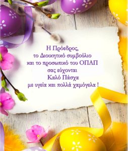 Η Πρόεδρος, το Διοικητικό συμβούλιο και το προσωπικό του ΟΠΑΠ σας εύχονται Καλό Πάσχα με υγεία και πολλά χαμόγελα!