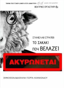 Σας ενημερώνουμε ότι για λόγους υγείας η προγραμματισμένη για σήμερα παράσταση του Θεατρικού Εργαστηρίου του Δήμου μας, «Το Σακάκι που