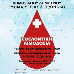 Το Τμήμα Υγείας και Πρόνοιας του Δήμου Αγίου Δημητρίου οργανώνει αιμοδοσία στο 3ο ΚΑΠΗ (Ολύμπου 36) την Τετάρτη 30 Οκτωβρίου