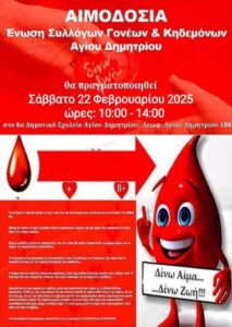 Το Σάββατο 22 Φεβρουαρίου 10:00-14:00 στο 6ο Δημοτικό Σχολείο Αγίου Δημητρίου, θα πραγματοποιηθεί η Αιμοδοσία της Ένωσης Συλλόγων Γονέων και