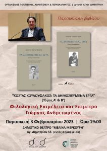 Ο Οργανισμός Πολιτισμού, Αθλητισμού και Περιβάλλοντος του Δήμου Αγίου Δημητρίου διοργανώνει την παρουσίαση του δημοσιευμένου έργου του Κώστα Κουλουφάκου (Εκδόσεις
