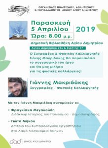 Την Παρασκευή 5 Απριλίου 2019 και ώρα 20:00, στη Δημοτική Βιβλιοθήκη Αγίου Δημητρίου, ο συγγραφέας και φυσικός καλλιεργητής, Γιάννης Μακριδάκης,