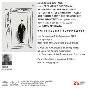 Την Παρασκευή 7-2-2020 και ώρα 20:00, στη Δημοτική Βιβλιοθήκη Αγίου Δημητρίου, θα γίνει παρουσίαση του νέου βιβλίου του Κώστα Αρκουδέα