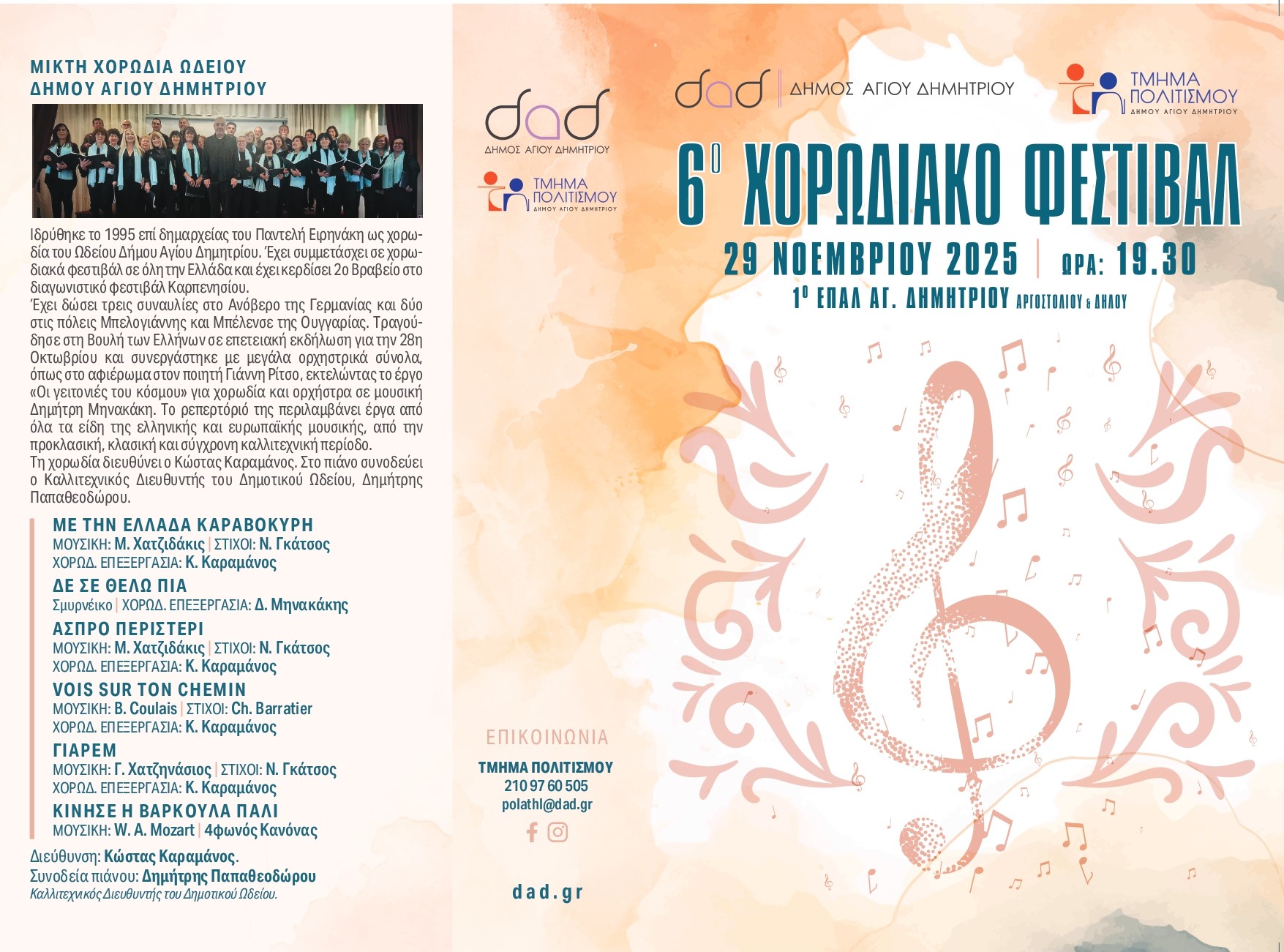 Και φέτος, λοιπόν, ο δήμαρχος Στέλιος Μαμαλάκης, η αντιδήμαρχος Παιδείας & Πολιτισμού, το Ωδείο Δήμου Αγίου Δημητρίου και η Μικτή Χορωδία έχουν τη χαρά να σας προσκαλέσουν στο Χορωδιακό Φεστιβάλ, που θα πραγματοποιηθεί το Σάββατο 29 Νοεμβρίου 2025 και ώρα 19:30 στο 1ο ΕΠΑΛ Αγ. Δημητρίου, Αργοστολίου & Δήλου.