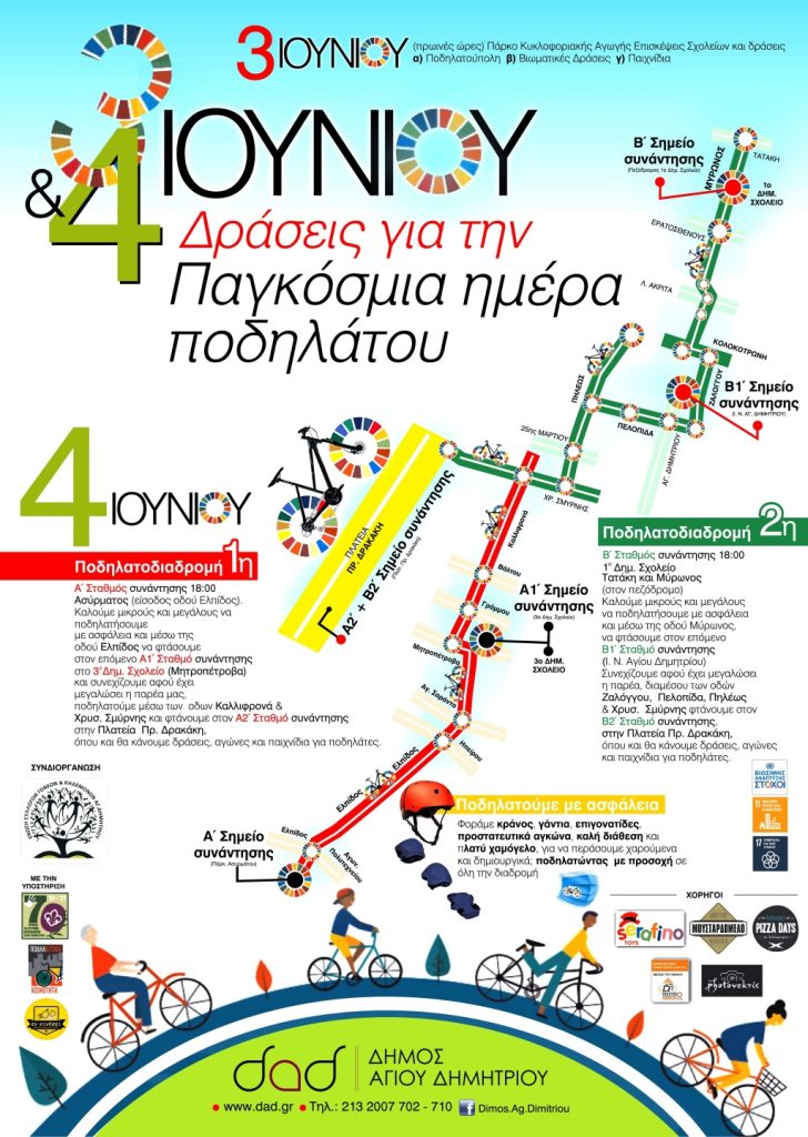 Με αφορμή την Παγκόσμια Ημέρα Ποδηλάτου στις 3 Ιουνίου, ο Δήμος Αγίου Δημητρίου διοργανώνει ποδηλατικές γιορτές στην πόλη γεμάτες δράσεις για τα παιδιά, που έχουν ως στόχο να προωθήσουν την ασφαλή μετακίνηση στην πόλη με ποδήλατο.