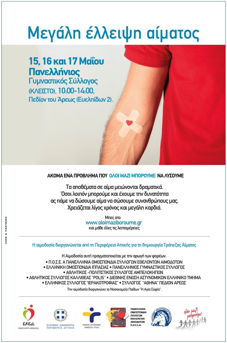 Η Περιφέρεια Αττικής διοργανώνει την 1η εθελοντική αιμοδοσία για τη δημιουργία Τράπεζας Αίματος, το τριήμερο 15, 16 και 17 Μαΐου 2020 και ώρες 10:00-14:00, στον Πανελλήνιο Γυμναστικό Σύλλογο που βρίσκεται στο Πεδίον του Άρεως (Ευελπίδων 2).