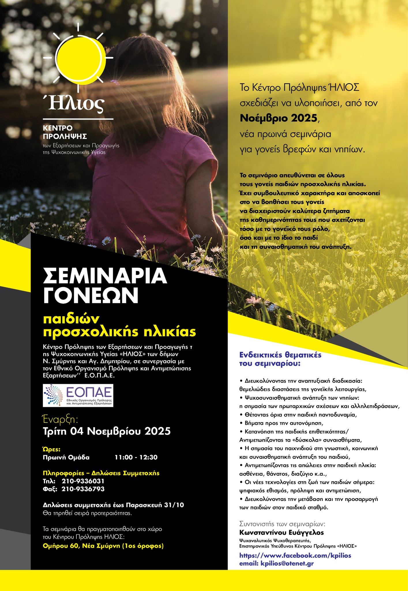 Κέντρο Πρόληψης Εξαρτήσεων ΗΛΙΟΣ: Νέος Κύκλος Σεμιναρίων Γονέων με παιδιά προσχολικής ηλικίας