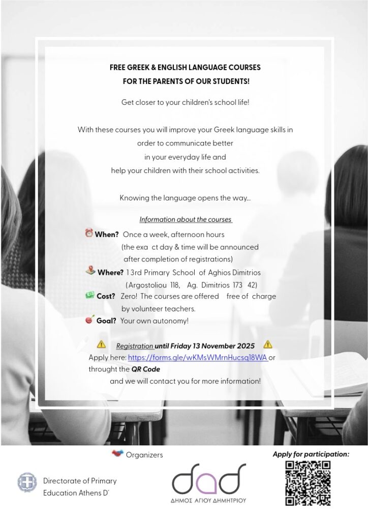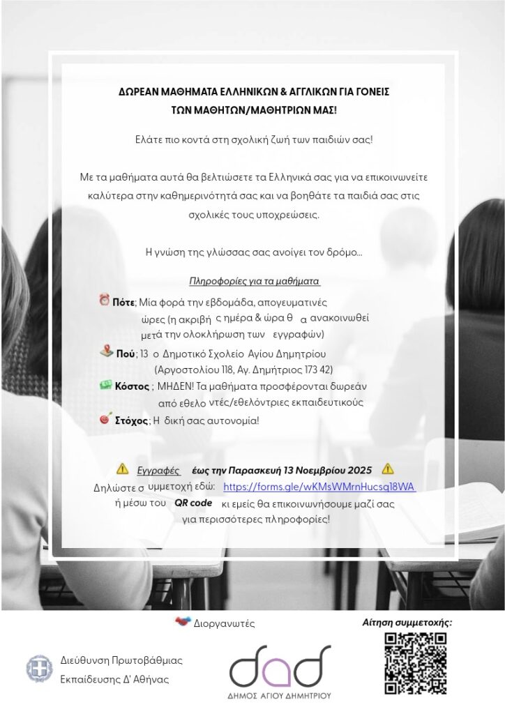 Η Διεύθυνση Πρωτοβάθμιας Εκπαίδευσης Δ΄ Αθήνας σε συνεργασία με τους Δήμους προσφέρουν μαθήματα Ελληνικών και Αγγλικών αρχαρίου επιπέδου σε γονείς μαθητών/μαθητριών που φοιτούν σε σχολεία των Δήμων μας κατά το σχολικό έτος 2025-2026.