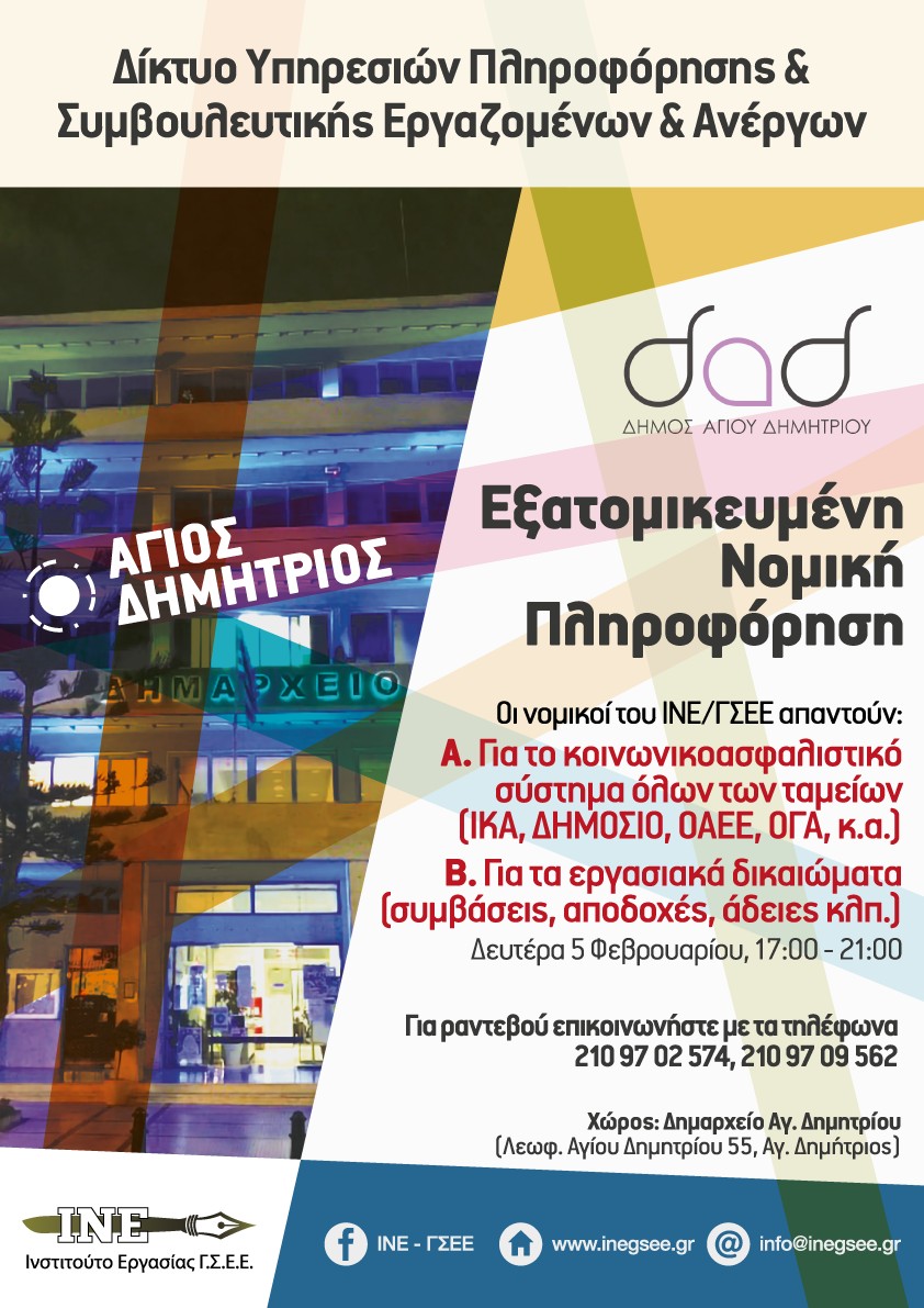 Το Δίκτυο Υπηρεσιών Πληροφόρησης και Συμβουλευτικής Εργαζομένων και Ανέργων σε συνεργασία με το Ινστιτούτο Εργασίας της ΓΣΕΕ (ΙΝΕ/ΓΣΕΕ), παρέχουν “εξατομικευμένη Νομική Πληροφόρηση”.