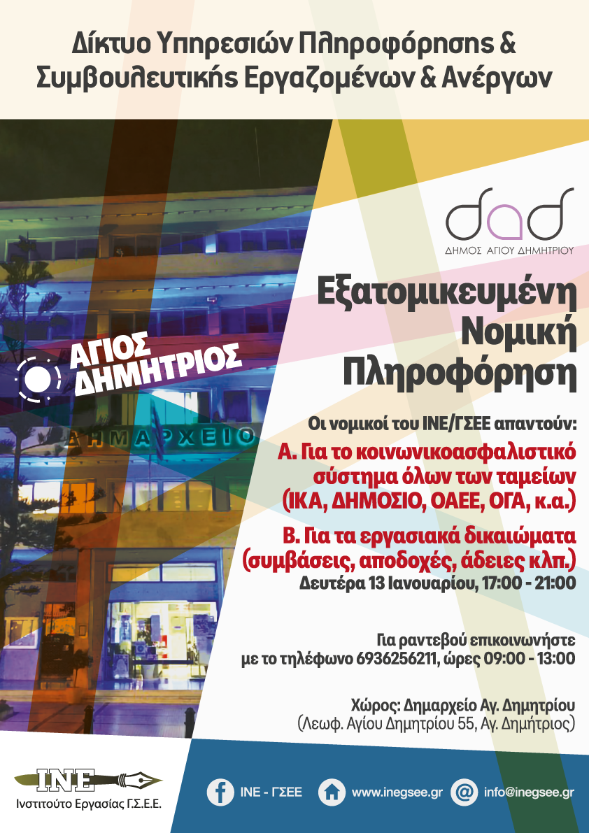 Σε συνέχεια της συνεργασία του Δήμου Αγίου Δημητρίου με το Ινστιτούτο Εργασίας της ΓΣΕΕ, παρέχεται η δυνατότητα παροχής υπηρεσιών συμβουλευτικής και πληροφόρησης σε καίρια θέματα που απασχολούν μεγάλη μερίδα των πολιτών και ειδικότερα, σε ζητήματα:
