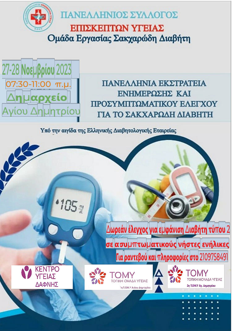 Στο πλαίσιο αυτό, οι επαγγελματίες υγείας της 1ης – 2ης ΤΟΜΥ Αγίου Δημητρίου και του ΚΥ Δάφνης συμμετέχουμε στην Πανελλήνια Εκστρατεία Ενημέρωσης και Προσυμπτωματικού Ελέγχου για το Σακχαρώδη Διαβήτη που διοργανώνει ο Πανελλήνιος Σύλλογος Επισκεπτών Υγείας και καλούμε τους πολίτες στις 27 και 28/11/2023 από ώρα 7:30 πμ έως και 11:00 πμ να προσέλθουν στο χώρο του Δημαρχείου Αγίου Δημητρίου για τριχοειδική μέτρηση σακχάρου και συμβουλευτική.