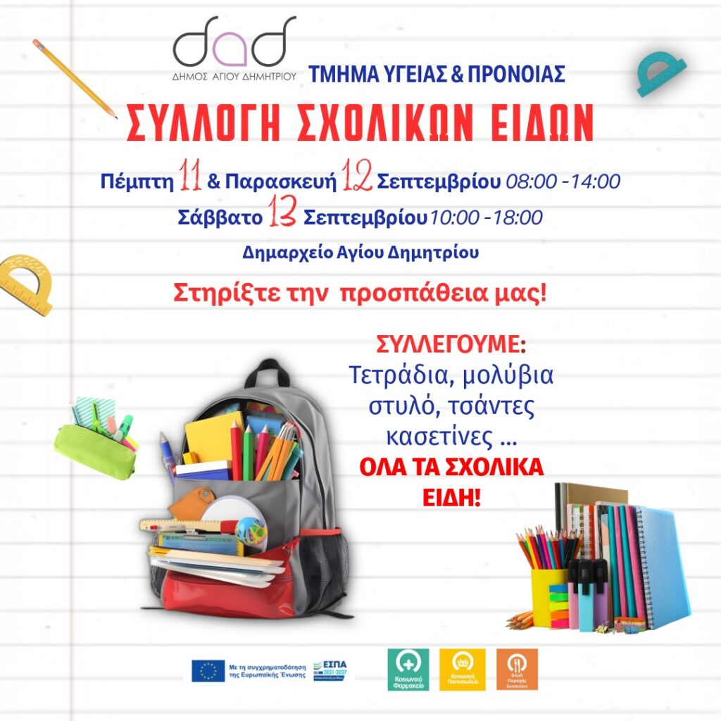Η συλλογή σχολικών ειδών θα γίνεται στο Δημαρχείο Αγίου Δημητρίου την Πέμπτη & Παρασκευή: 08:00 – 14:00 και το Σάββατο: 10:00 – 18:00.